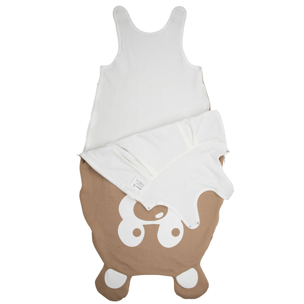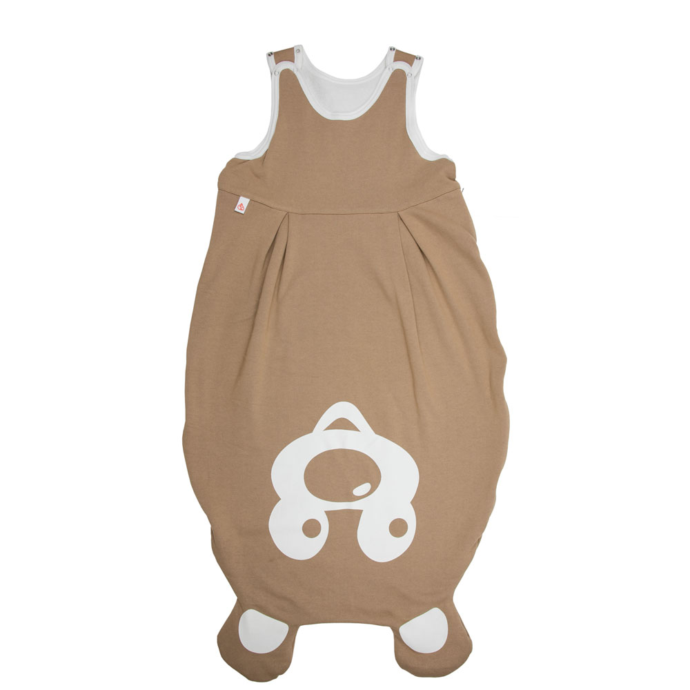 Der farbenfrohe Wende-Schlafsack ist aus 100% Bio-Baumwolle (kbA) hergestellt, außen Jersey, innen kuschelweicher, wärmender Frottee. Dieser flauschige Frottee-Schlafsack ist der ganzjährige Begleiter für Kinder beim Schlaf. Seitlich ist er per Reißverschluss zu öffnen. Die längenverstellbaren Träger ermöglichen ökonomisches Mitwachsen über vier Größen. Die Ohren des Bären können mit den Füßen „belebt“ werden. So ist in der Früh im Kinderzimmer der Bär los und die Eltern haben fünf Minuten länger Schlaf.